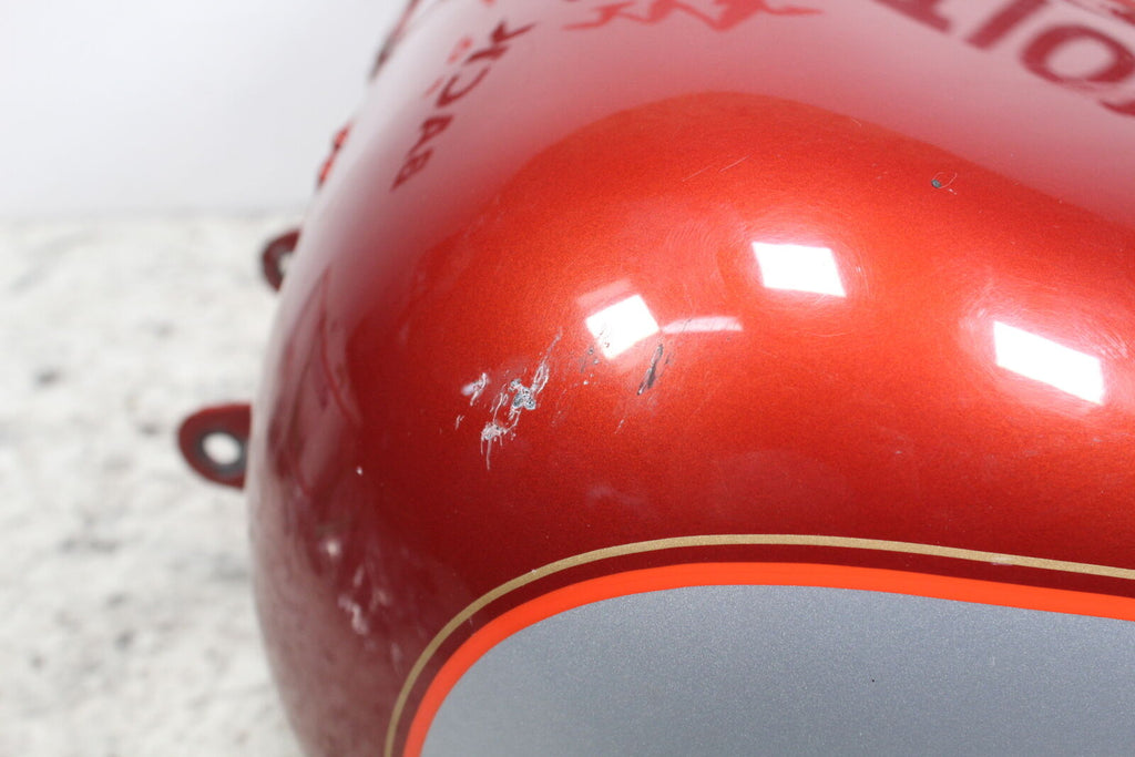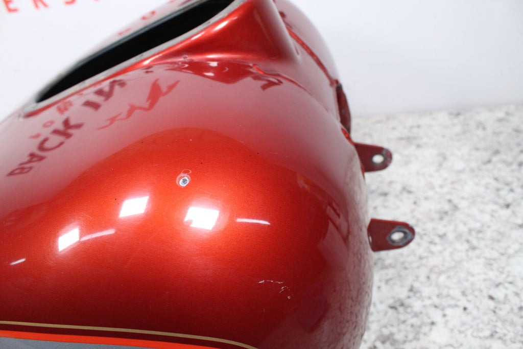 This Fuel Tank is in fairly good condition. This item does not have any leaks. There are no cracks in this item. This item works well. This item has some scratches and wear marks on it and one dent on the lower left front edge. The color is diamond ice/aztek orange.