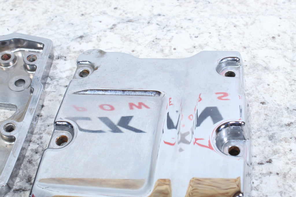 This rocker housing is in good condition. This is for one lower and one upper rocker box cover. There are no cracks in these items. These items are straight. These items work well. This item has some scratches and wear marks on it.