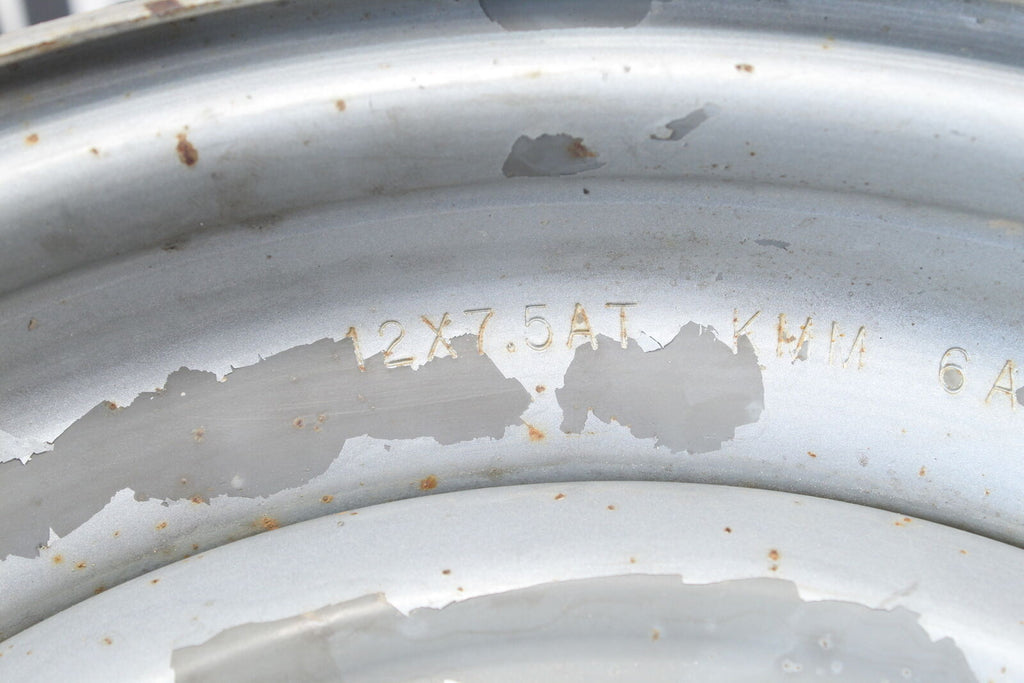 This Rear Wheel is in good condition. This item is straight. This item works well. The paint on this item is peeling. This is a 12" rim. This wheel has a 4/137mm bolt pattern. This wheel is 7.5" wide.