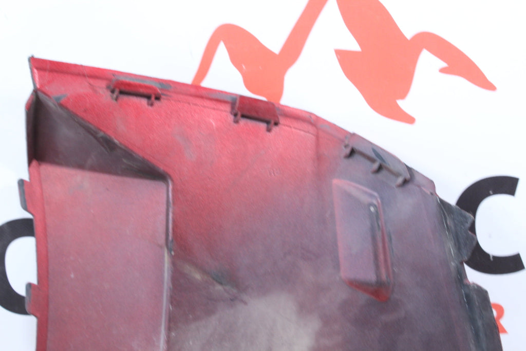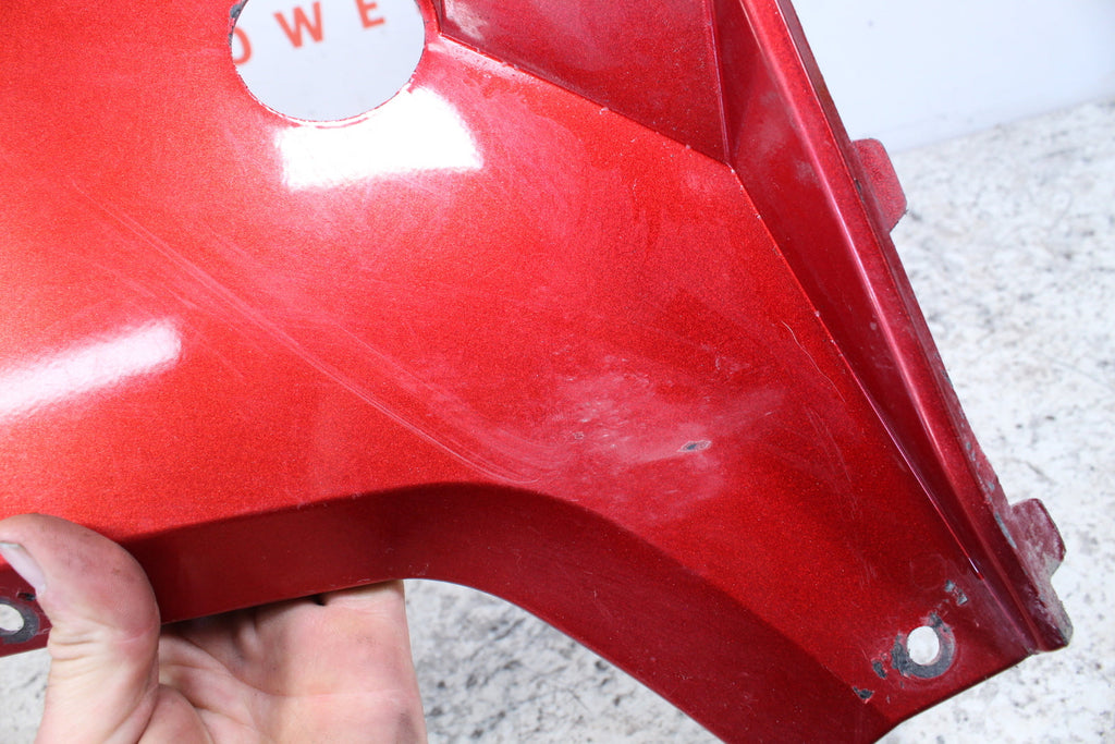 This side cover is in good condition. There are no cracks in this item. This item is straight. This item works well. This item has some scratches and wear marks on it. This is a sunset red color.