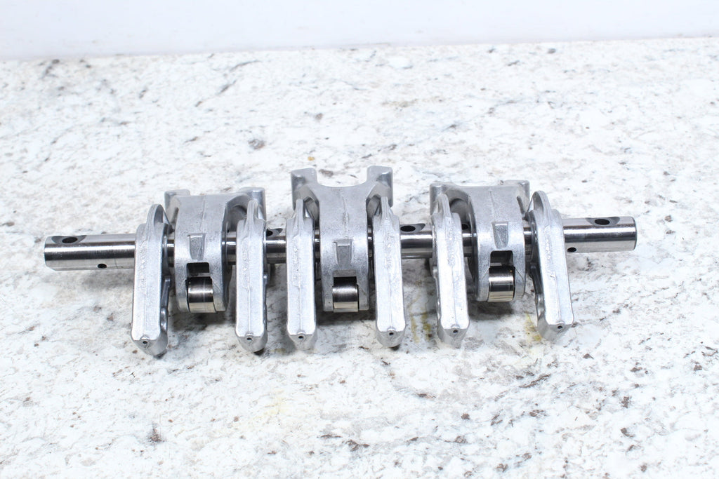 This rocker arm assembly is in good condition. This rocker arm assembly has good bearings. This came off a good running machine. There are no cracks in this item. This item is straight. This item works well.