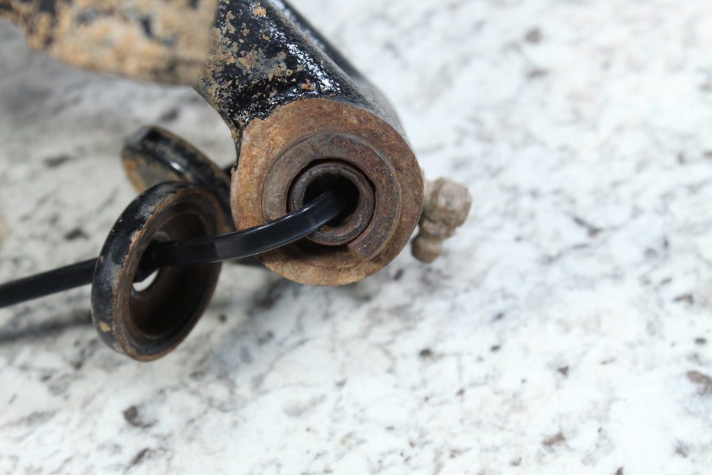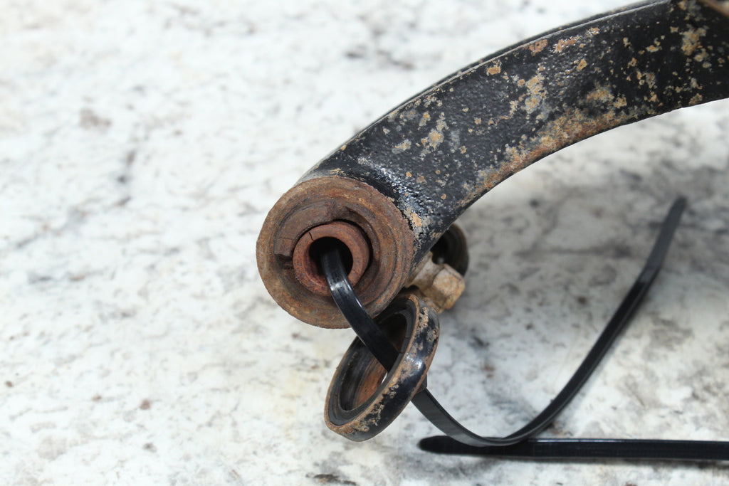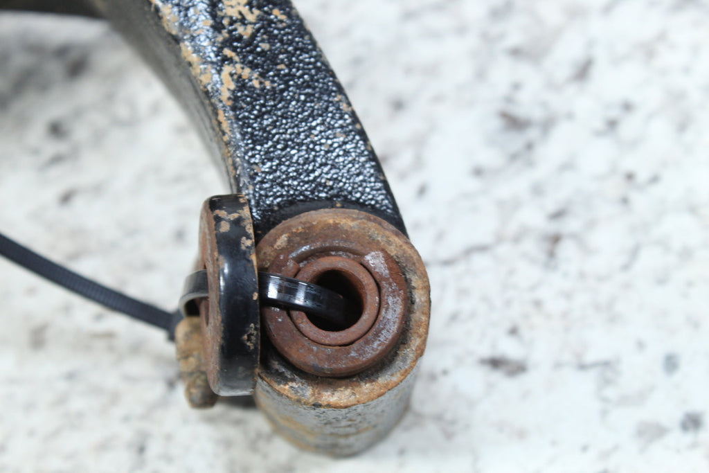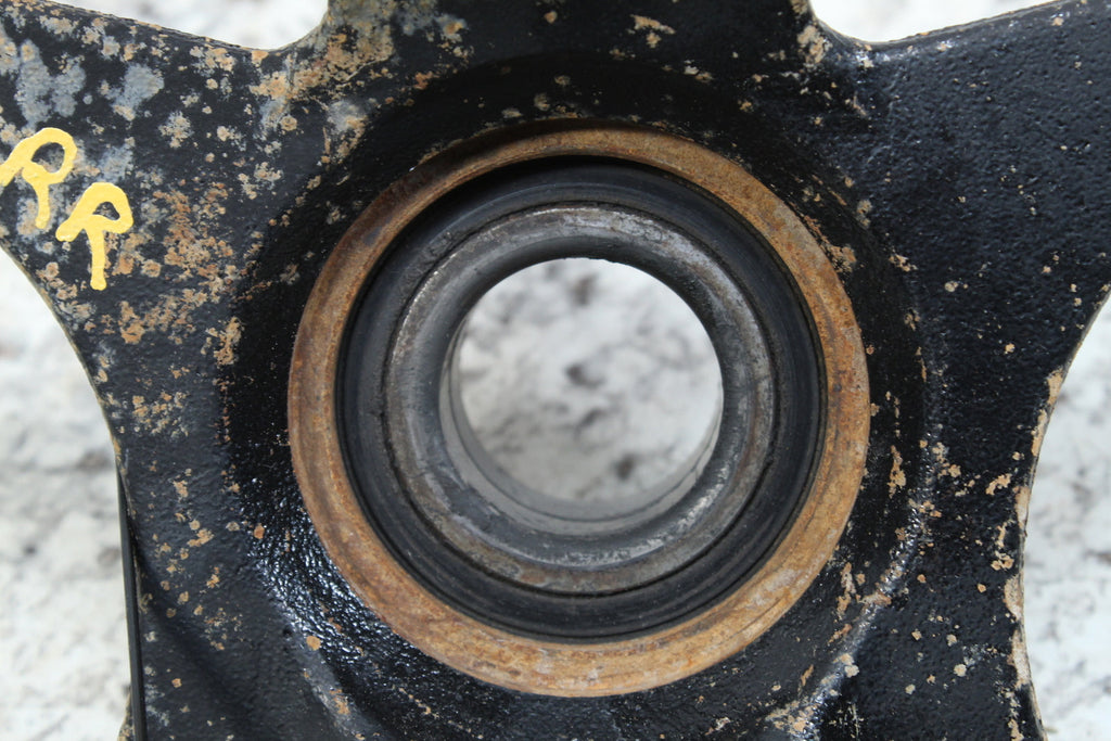 This rear knuckle spindle is in fairly good condition. This rear knuckle spindle has good bearings. There are no cracks in this item. This item is straight. The bushings have some wear.